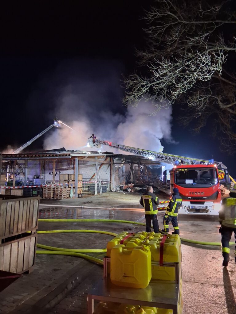 Beim Eintreffen der ersten Kräfte stand eine rund 1.500 Quadratmeter große Halle eines landwirtschaftlichen Betriebes bereits in Vollbrand. In dem Gebäude befanden sich landwirtschaftliche Maschinen, ein Dieseltank, Gasflaschen sowie ein großer Batteriespeicher der Photovoltaikanlage auf dem Hallendach. Mehrere Gasflaschen explodierten während des Einsatzes.