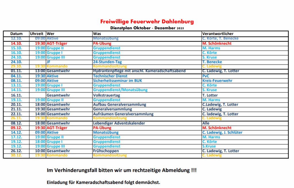 Ihnen stehen drei Gruppenführer, ein Jugendwart, zwei Gerätewarte und zwei Atemschutzwarte zur Seite. Des Weiteren sind noch einige Sonderfunktionen innerhalb der Feuerwehr vergeben. Sie alle bilden das Ortskommando der FF Dahlenburg.